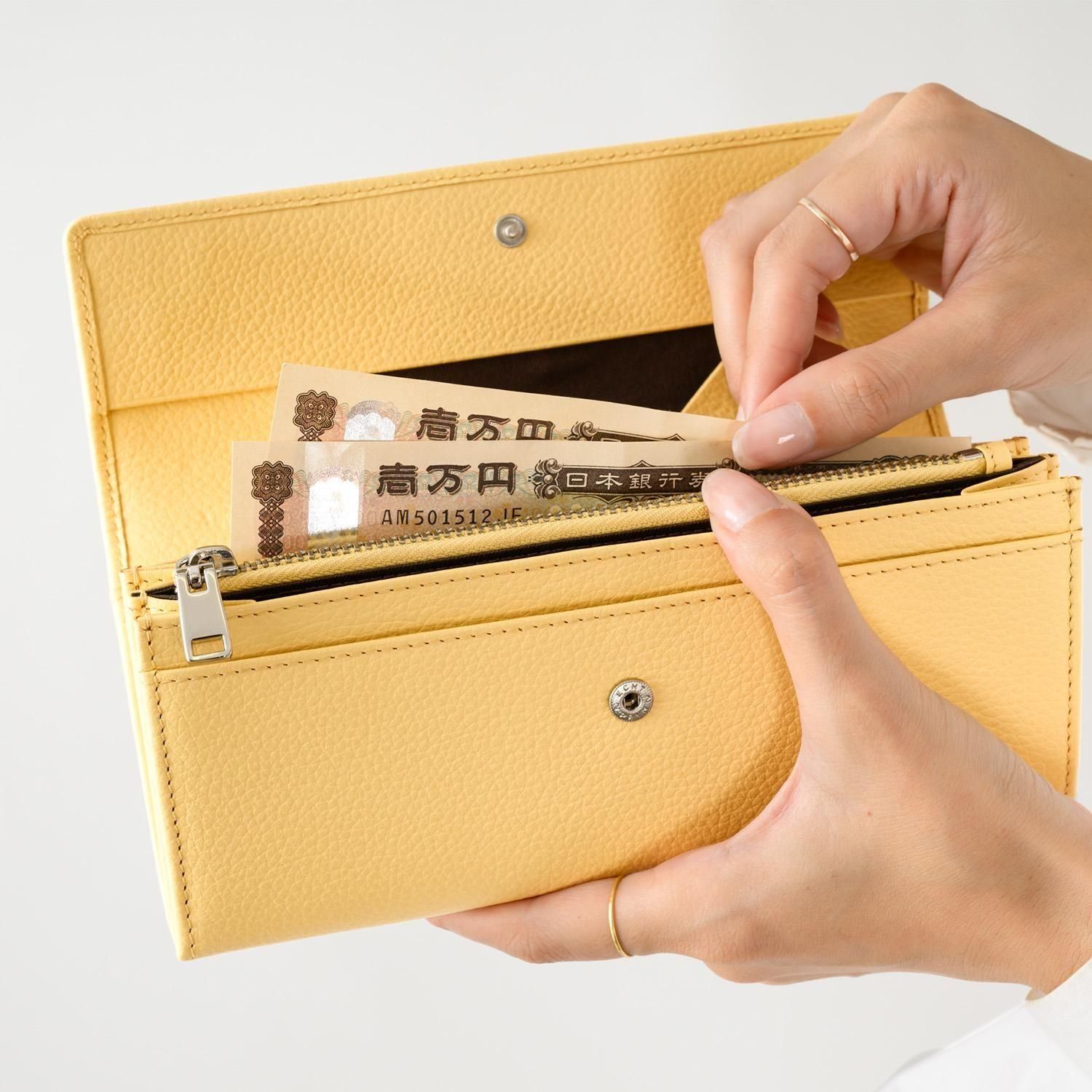 欧州の業務用財布からインスパイアされたカード多機能財布です。最大の特長はガバッと大きく開く小銭入れです。ひと目で小銭が確認でき、出し入れも便利です。クレジットカードが22枚収納でき、お札も折らずに収納可能です 素材は、牛革を使用。革表面に小さなシボ(凹凸)の型押しを施したシュリンクレザーを使用しています。シュリンクレザーの特長は、柔らかく、色味がキレイなところです。