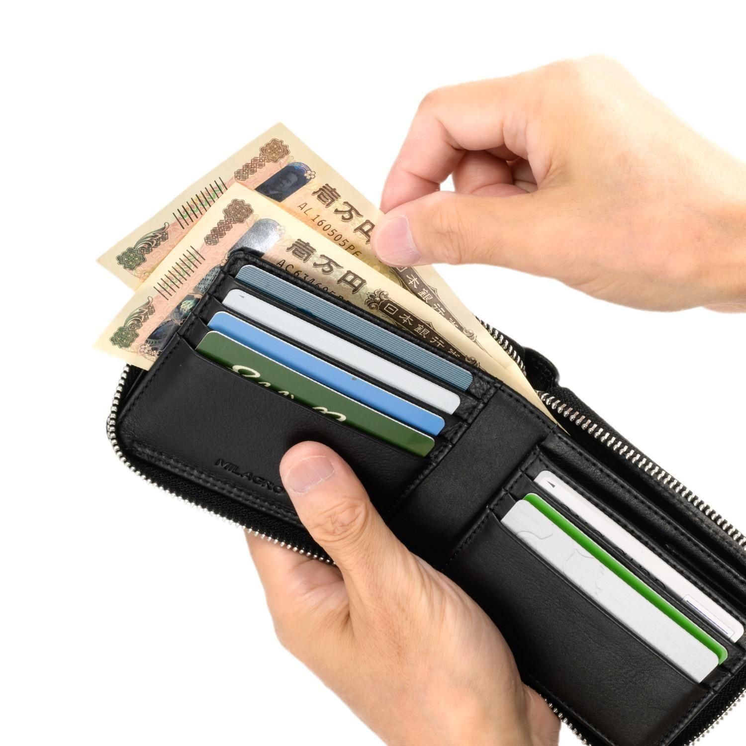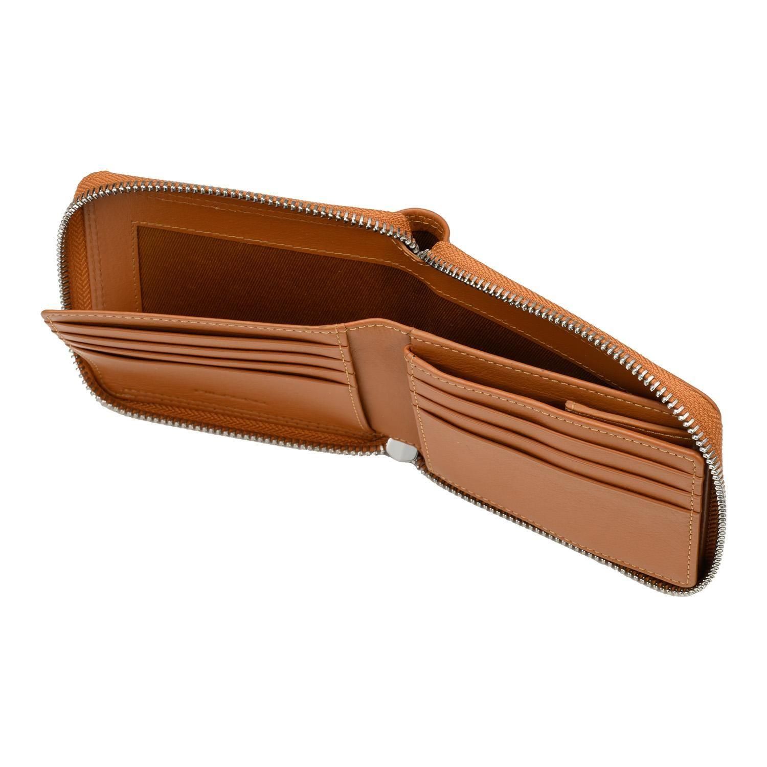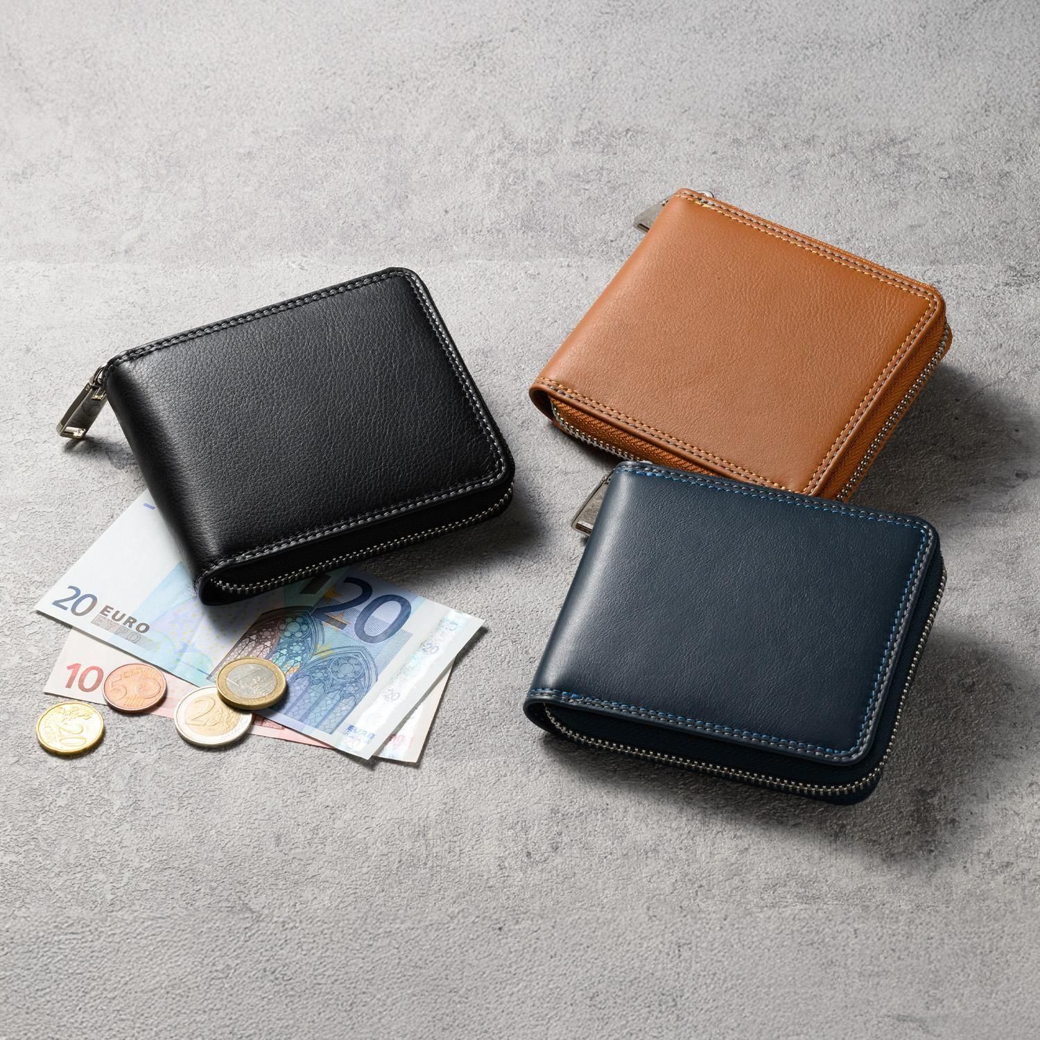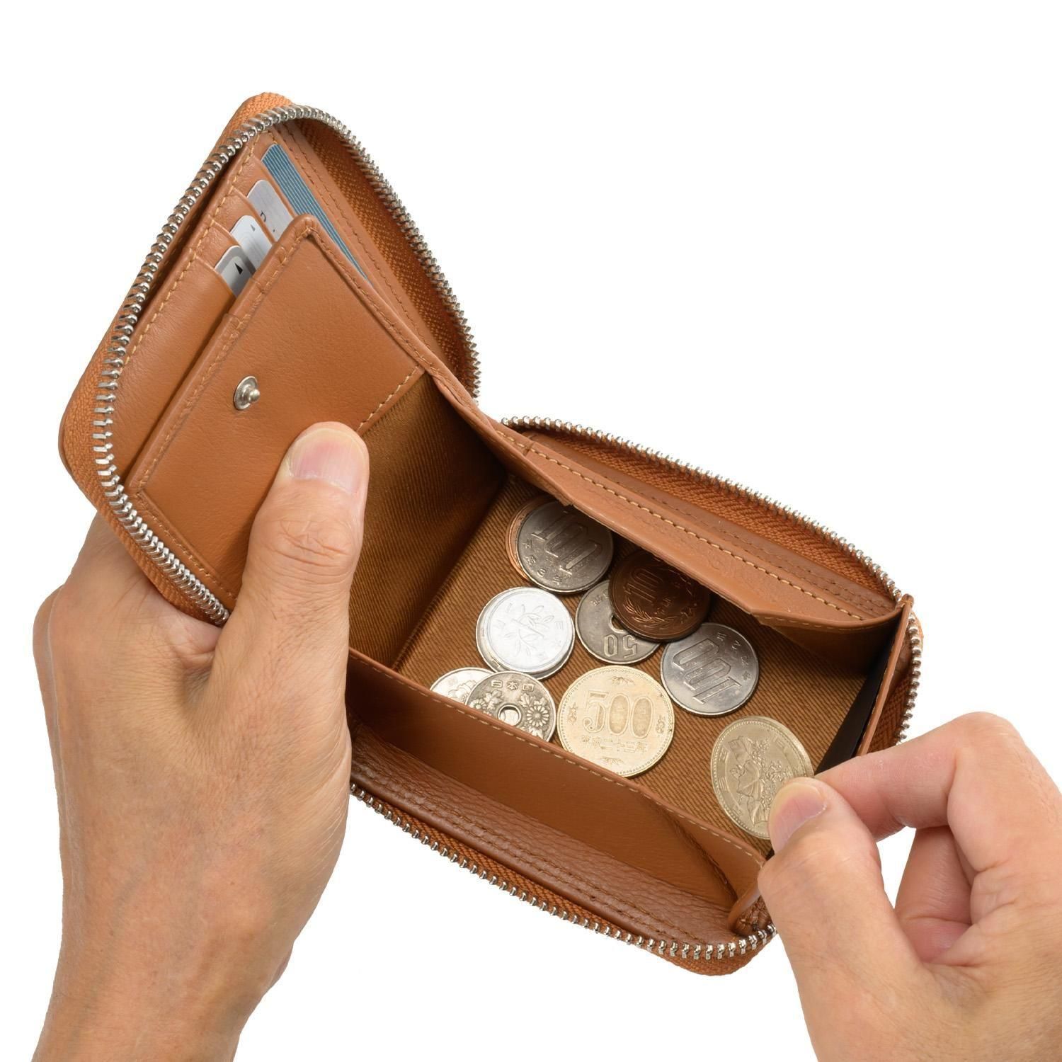 内部は、使いやすいボックス型の小銭入れと取り出しやすい札入れがあります。札入れは片側がオープンで、お札を斜めから収納可能です。カードポケットも左右に付いており収納も抜群です。仔牛と成牛の中間的な存在で、繊維質の緻密さと強度を併せ持つ牛革のキップレザー使用しています。耐久性がカーフレザーよりも強く、それでいてカーフレザーのようなソフトな手触りが特長です。
