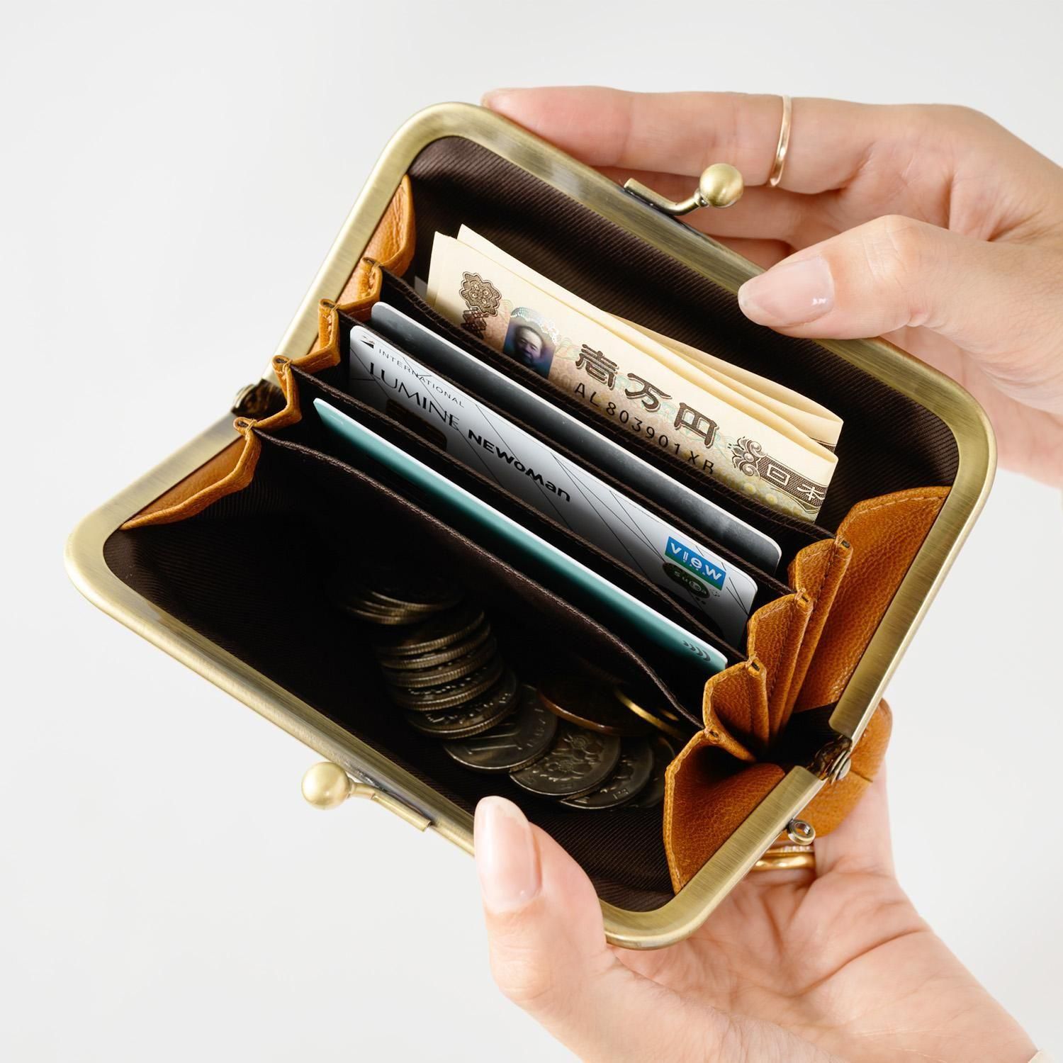 がま口を開くと、カード入れを3ヶ所、オープンポケットを2ヶ所備えています。開口部が蛇腹で大きく開くので、中身がぱっと一目で見渡せます。スクエア型のフォルムと口金デザインで、上品さをプラス。素材は、山羊革(ゴートレザー)。牛革と比べ革表面の表情が豊かで、傷が付きにくく丈夫な革です。使っていくうちに柔らかくなり、また光沢感が増していく経年変化に富んだ革です。