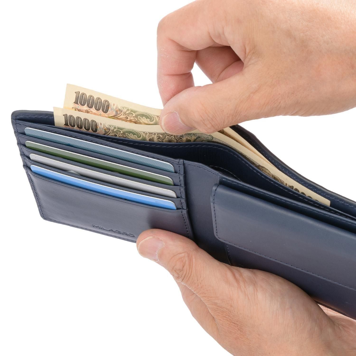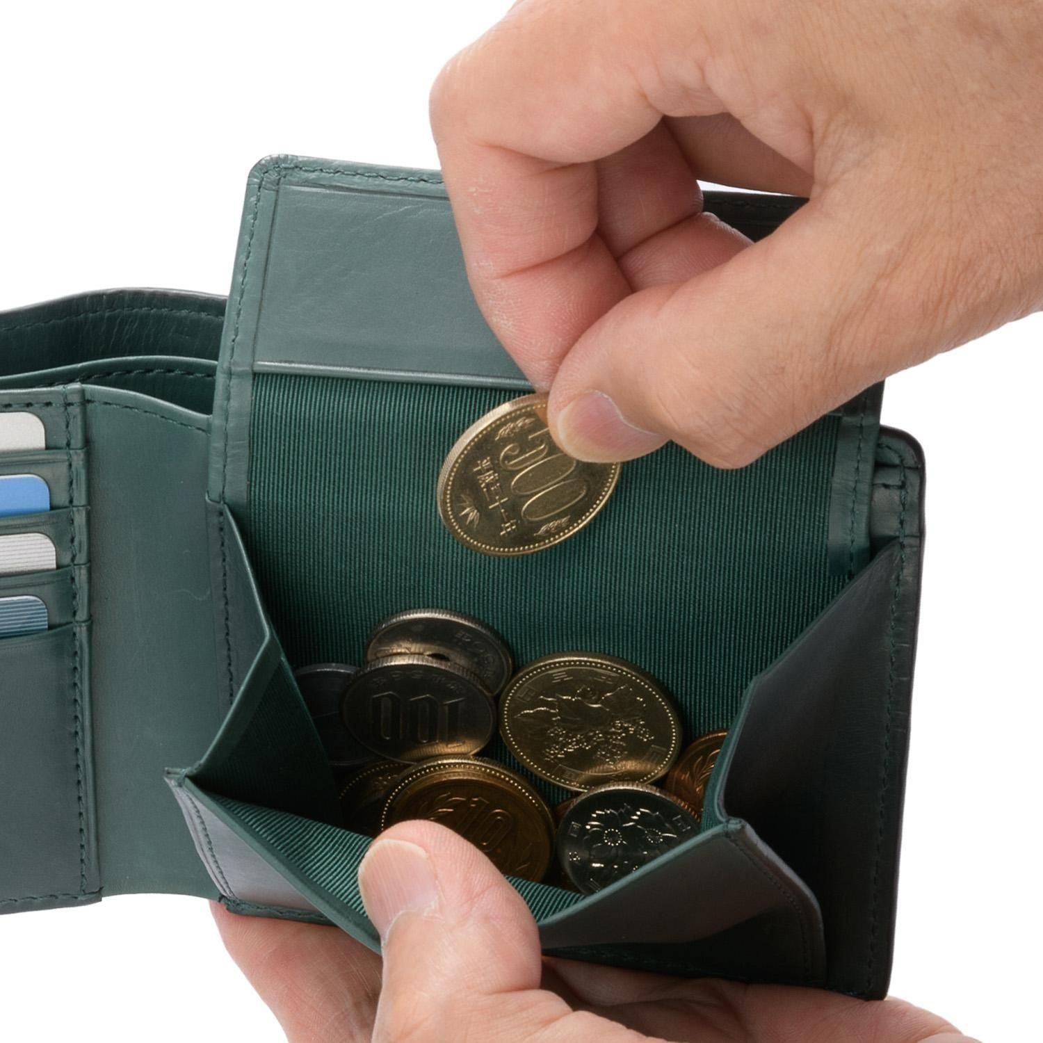 素材は、兵庫県姫路地方でなめされた植物性タンニンなめしの山羊革(ゴートレザー)を使用。その手触りと革表面の表情は「精悍さ」に溢れた最高の素材です。スタンダードなフラップ式小銭入れの2つ折り財布です。仕切り付きの札入れ、マチが大きく開くフラップ式小銭入れ、複数のカードポケットなど収納力抜群で、シンプルで使いやすいデザインが魅力です。