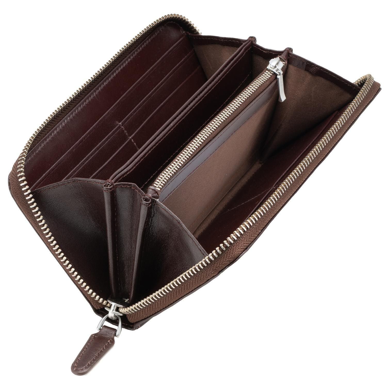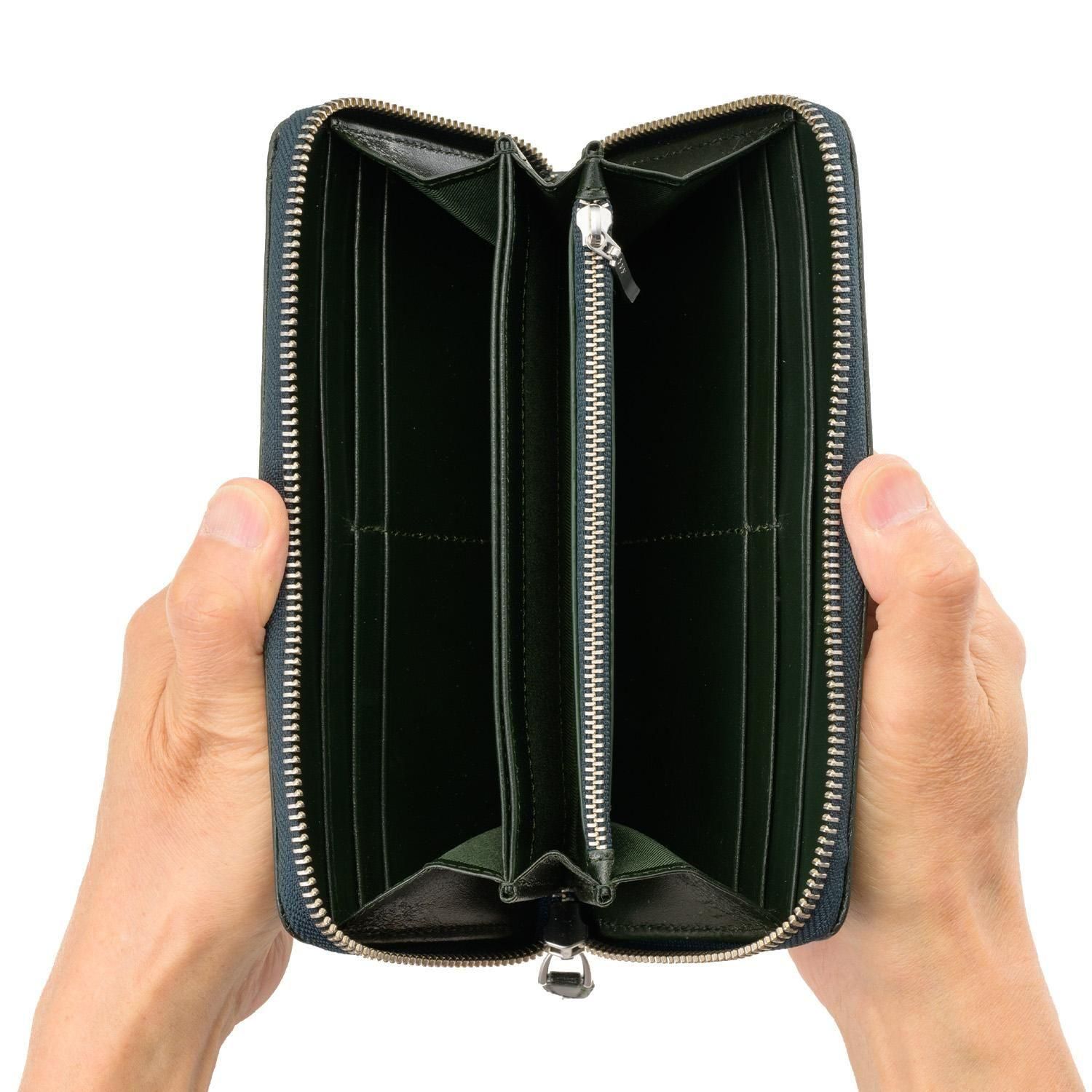 大きく開き、中央部の2つの仕切りがファスナー小銭入れとオープンポケットになっている、使い勝手の良い仕様となっています。