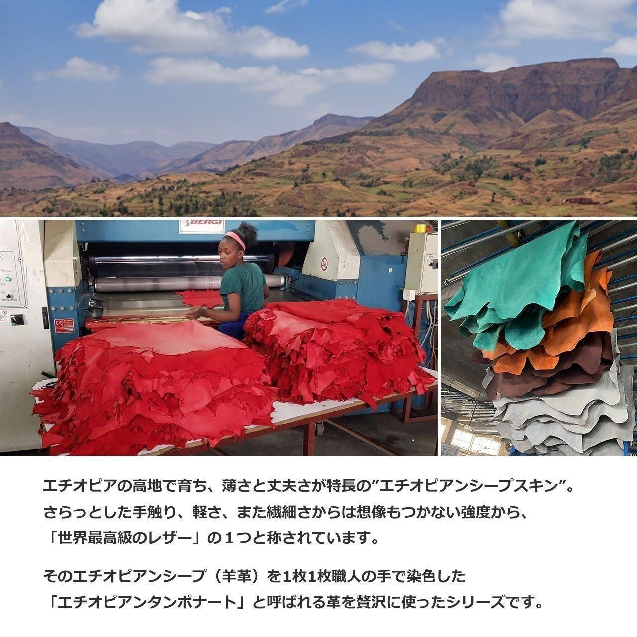 エチオピアの高地で育ち、薄さと丈夫さが特長の”エチオピアンシープスキン”。 さらっとした手触り、軽さ、また繊細さからは想像もつかない強度から、「世界最高級のレザー」の1つと称されています。そのエチオピアンシープ(羊革)を1枚1枚職人の手で染色した「エチオピアンタンポナート」と呼ばれる革を贅沢に使ったシリーズです。